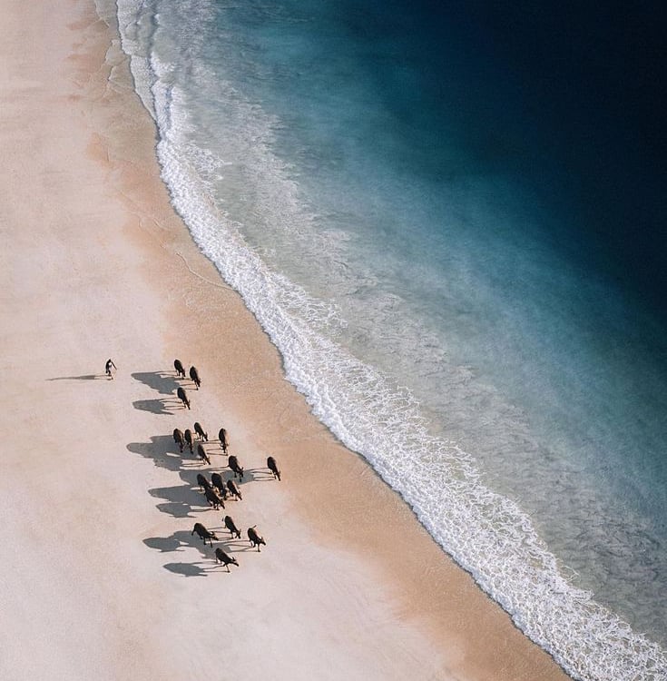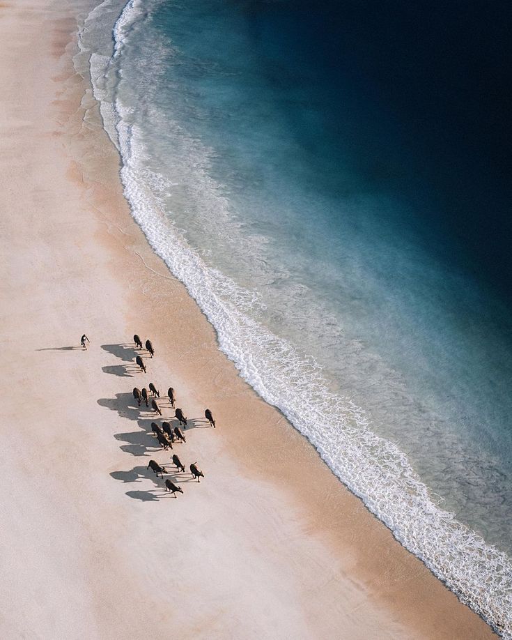 Authentic local life, including fishermen and livestock occasionally passing along the shore.